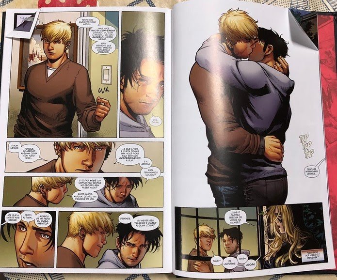 A obra está no centro de uma polêmica. Ao longo desta semana, correntes em redes sociais reclamavam da cena, em uma das páginas, em que dois personagens masculinos se beijam.